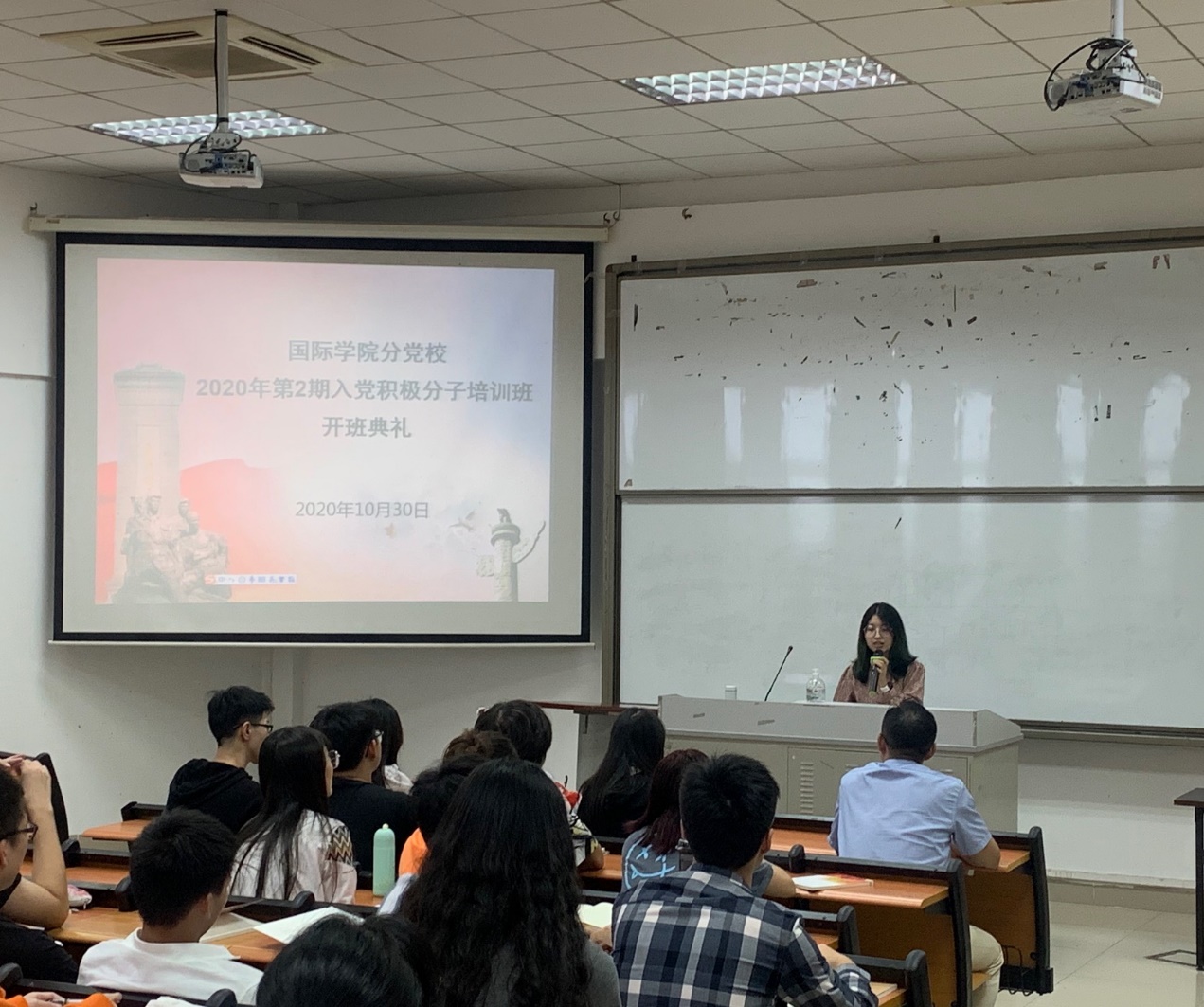 2020年第二批入党积极分子培训班开班仪式上,新学员代表曾爽同学首先代表全体学员发言,表明新学员的学习动力与决心。钟梦娜老师随后宣读《培训班考勤与课堂纪律》,号召全体新学员严格要求自身,认真学习党课内容。