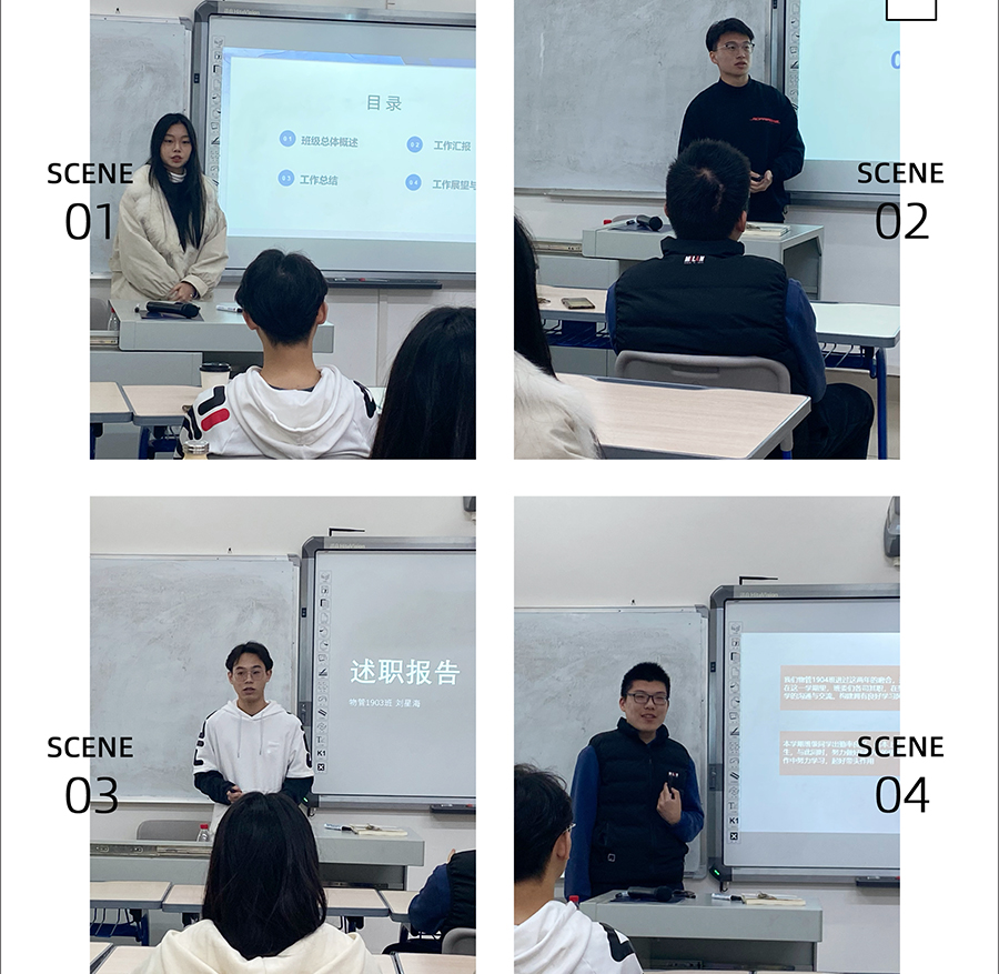 参与本次述职报告的八位班长按照会议前抽签顺序一一进行展示。他们在述职报告过程中着重点不一,内容涵盖了班级发展、班级问题、班级成就、班级优秀个体、班级团建、班级目标。每位班长的述职报告要求在五分钟之内完成,目的在于加强班长对述职报告的重视,提高班长展示汇报的能力。