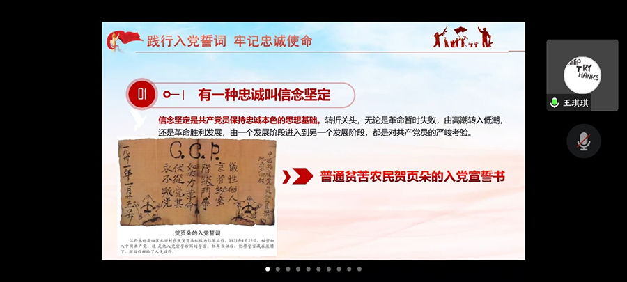 王琪琪老师以“学党章,强党性——以入党誓词为例”为主题展开入党积极分子培训班第二课,带领全体学员共同学习了中国共产党入党誓词的历史源起和沿革变迁。她具体分析了大革命和土地革命时期、抗日战争时期、解放战争时期、新中国成立前后和党的十二大以来等不同时期入党誓词的内涵,入党誓词是一部浓缩的党章,用最精炼、最质朴、最有力的语言诠释了中国共产党是什么样的党,是共产党员对党和人民做出的庄严承诺,是一代又一代中国共产党人面对鲜红党旗右手握拳一字一句许下铮铮誓言。入党誓词的沿革反映了我们党从不放松党的建设,反映了我们党善于把握不同历史时期的主题和要求来发展党员,反映了我们党高度重视对党员进行党性教育和理想信念教育,反映了我们党具有与时俱进的先进性。