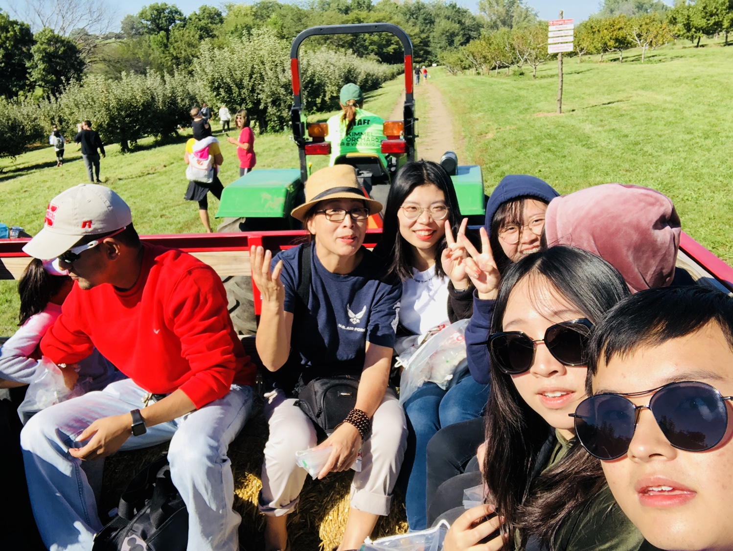 到下午两点半的时候,我们去了当地最大的苹果园,今年苹果大丰收,人异常的多。每人交了5美金的门票,进去后我们才发现,这不是农场简直就像一片低矮的森林啊。绿油油的一片都是苹果树,周边还有葡萄架、南瓜地和梨树等等各种水果植物。我们还有幸人生第一次坐了拖拉机进入了园子,这对于我们这些生活在城市中,几乎没有去过农村的同学们来说,可以说是一次珍贵的体验。我们看到了美国农场的一体化和全自动化,美国的高科技不仅仅运用于城市中,也全面运用到了种植业。在这里我们第一次体验了什么叫做“奢侈”,所有的苹果都可以随便摘,咬一口不甜?扔了再换一个。大家在欢声笑语中不仅填饱了肚子,还享受了“奢侈”的待遇。