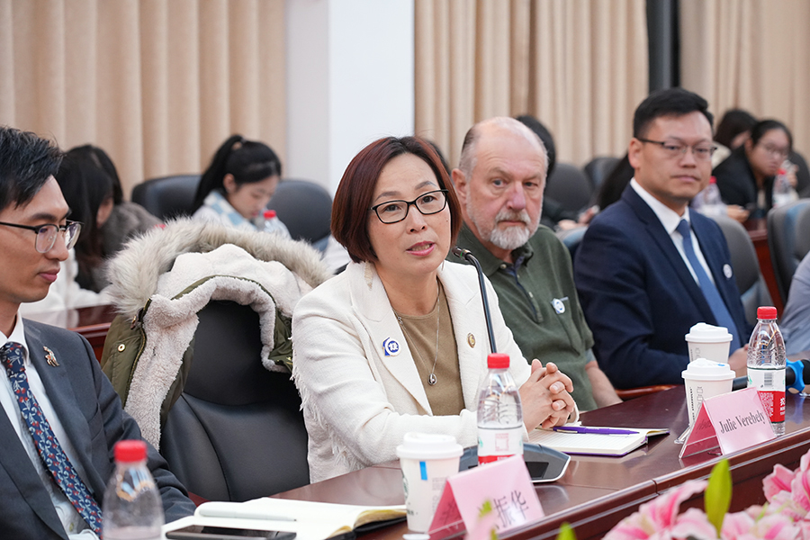 会上,校方领导及项目老师和与会家长、员工进行了互动,家校双方对项目员工留学的学习安排、员工的教育目标、员工未来的职业发展等问题进行深入探讨,家长们表达了对办学项目的肯定,同时也提出了对留学安全、读研深造、住宿管理、留学费用和语言要求等方面的担忧和疑问,Julie Verebely和公司领导对家长及员工关切的问题进行详细解答。