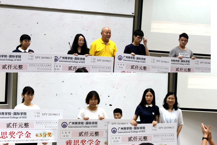 在2016级、2017级出国员工欢送会上,仲铭锦和龙海英为获得雅思奖学金的同学