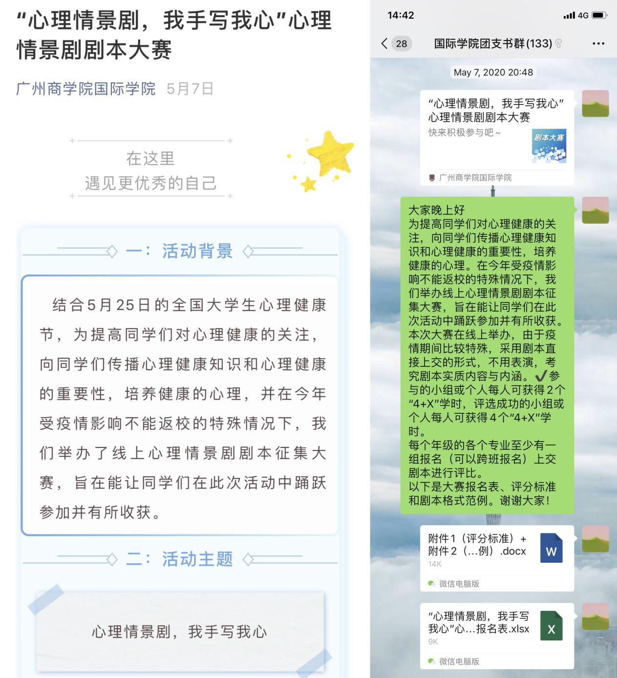 为提高同学们对心理健康的关注,公司通过将心理安全问题与戏剧形式相结合的方式,于5月7日下发“心理情景剧,我手写我心”心理情景剧剧本大赛报名推文,鼓励员工们踊跃参与,通过全新的方式,使同学们在学习有关心理知识的同时,提高同学们协同合作的能力,增加了学习的乐趣。