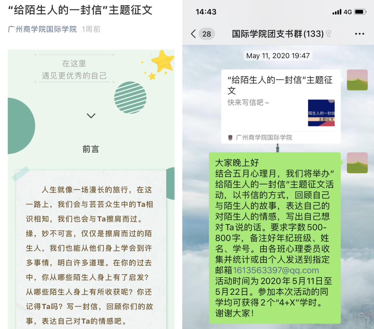 此次心理月活动成绩斐然,受到广泛好评,同学们都认真积极地进行参与,呈现了许多优秀的作品。其中,在“给陌生人的一封信”征文活动中,我们共收到了66封信件,我们从中选出14篇优秀的作品并截取温暖片段通过推文展现出来,给大家欣赏。