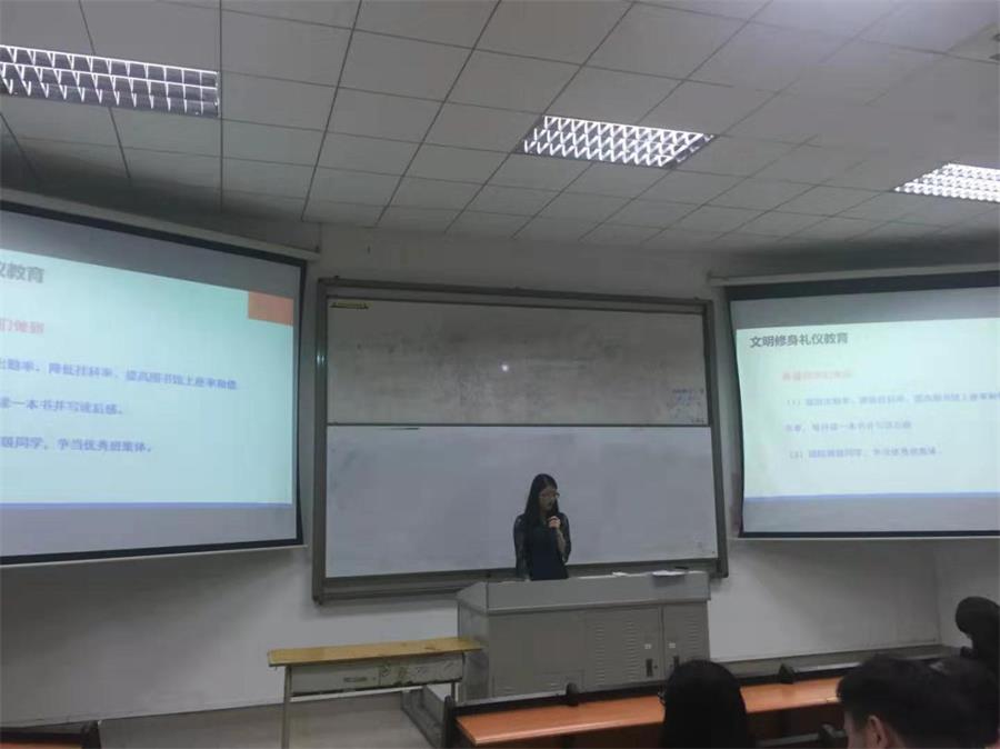 朱小芳首先总结了开学到现在以来,同学们的学习、生活等方面的情况,其中,重点提及到员工的学分问题,以及教育部关于取消毕业生清考、补考等问题。接着,她分别从安全工作、文明礼仪修养等方面对同学作出了要求。在安全方面,主要从“交通安全、财产安全”、“卫生问题、心理问题”等方面入手,用实例为同学们讲述了安全的重要性和必要性。在文明礼仪修养方面,要求同学们要遵守公司的规章制度,按程序办事;课堂上要尊重师长,不带早餐进教室。最后,她希望同学们做到:不忘初心,牢记使命;提高出勤率、降低挂科率、提高图书馆上座率和借书率,每月读一本书并写读后感;同时,班干部要起好带头作用,组织好班级建设,班级同学要团结一致,增强班级凝聚力,争当优秀班集体。