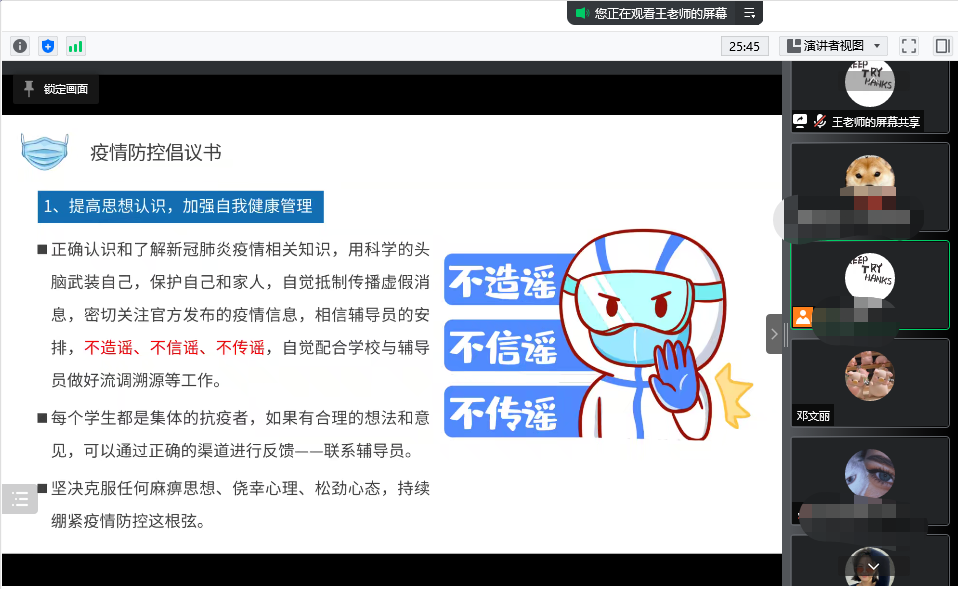 为进一步落实疫情防控要求,共建平安和谐校园,10月27日晚,伟德国际1946亚洲版2019级专升本在腾讯会议上召开年级会议,辅导员王琪琪主持会议。 辅导员王琪琪向同学们介绍了近期广州市疫情动态,传达了公司疫情防控会议精神。她强调,当前同学们务必关注疫情动态,做好个人防护,加强身体锻炼,继续落实晚点名、晨午检、全员核酸等常态化管理措施。她提醒同学们注意甄别网络信息,做到不轻视,不恐慌,不传谣,如遇特殊情况及时上报。同时,辅导员提醒同学们增强防诈意识,了解诈骗的各种形式,谨防有不法分子假借疫情之名行骗,...