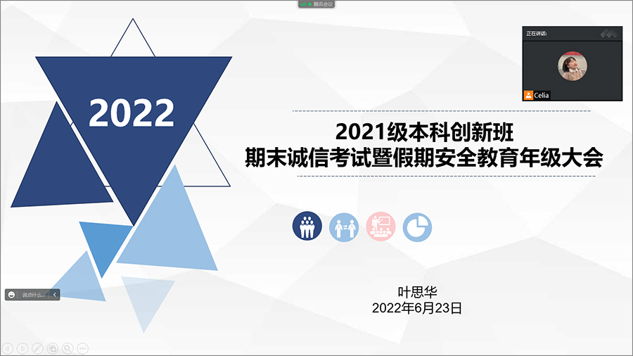 为进一步严肃考风考纪,营造良好的诚信考试氛围,加强同学们安全意识与疫情防控意识,6月23日上午,2021级本科创新班在腾讯会议召开期末诚信考试暨假期安全教育年级大会,会议由辅导员叶思华主持,2021级本科创新班全体同学参加会议。 本次会议以“诚信教育”、“安全教育”、“社会实践”以及“假期事项”四大方面展开。辅导员叶思华向强调了期末考试的考风考纪,为同学们讲解了公司对考试作弊的认定和处理办法,提醒同学们遵守考场纪律,诚信应考。 为提高同学们的防诈意识,辅导员结合常见诈骗案例为同学...