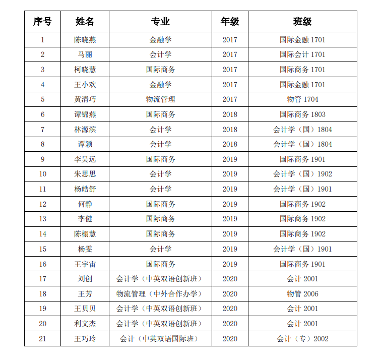 根据《广东省教育厅关于印发<关于做好 2020 年普通高校本专科生国家奖助学金工作>的通知》和《伟德国际victor1946国家奖助学金管理办法(试行)》(广商学字〔2017〕17 号)经个人申请、班级、年级、公司员工评定小组评定,确定以下21名同学拟获国家助学金。现予以公示。 公示时间:2020年11月10日—2020年11月12日。公示期内如有异议,可到伟德国际1946亚洲版215办公室曹磊老师处具名反映。 联系方式:020-87279804 伟德国际1946亚洲版 2020年11月10日 附...
