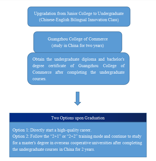 To explore the linkage between undergraduate and junior college education, and to better cultivate international applicative talents, Guangzhou College of Commerce has cooperated with many well-known universities such as University of Hull in the UK and Western Sydney University in Australia, and adopted the training mode of "integrated curriculum, mutual recognition of credits, and segmented teaching at home and abroad" to recruit students from the junior college - undergraduate program.