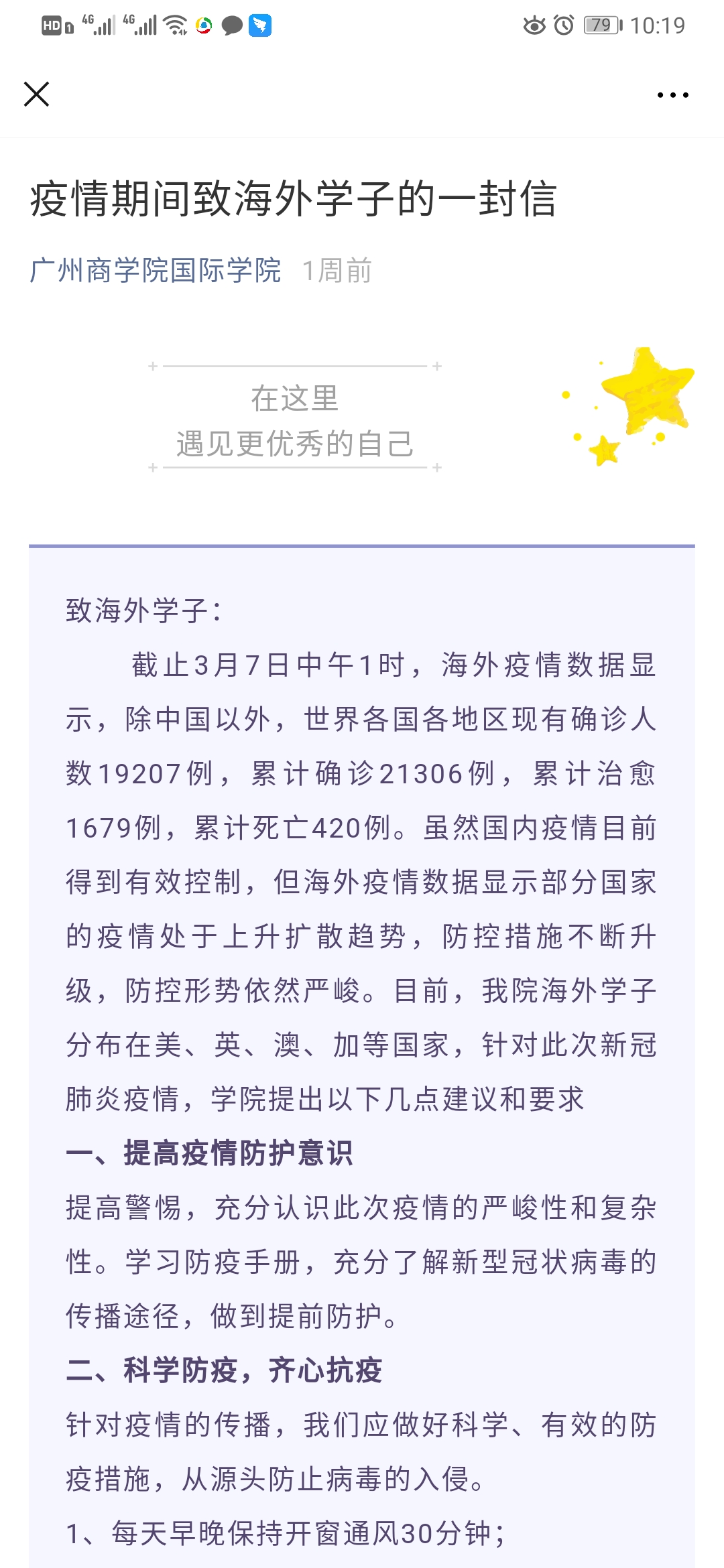 We need to increase awareness and ability. The school sends out a letter to overseas students during the epidemic via WeChat public account, overseas student information group, and student parent group, and convenes an online meeting of representatives of overseas cooperative colleges, overseas students, and parents of students to guide them to treat the epidemic to improve the awareness and ability of overseas students in prevention and control.