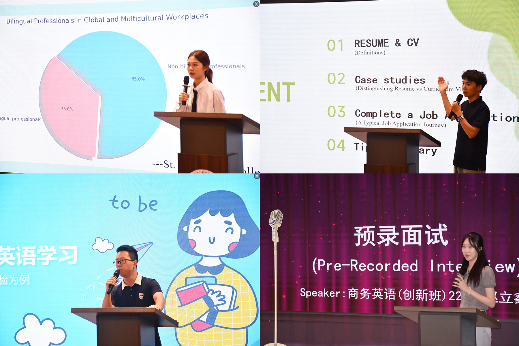 在此次汇演中,同学们紧紧围绕多元且实用的主题,带来了一场场精彩绝伦的演讲。演讲内容丰富多样,演讲选手们有的分享英语口语与商务英语学习经验,有的探索AI技术助力雅思备考的方法,有的讲解实习工作寻觅过程中的实战策略,有的深刻剖析生活热点并倾囊相授学习技巧。每一个演讲都凝聚着同学们的深度思考与反复打磨。演讲过程中,同学们语言流畅自然、情感真挚动人。同学们以鲜活生动的案例引发听众强烈共鸣,凭借严谨缜密的逻辑征服全场,充分展现出扎实的语言功底与独特的个人魅力,深度诠释了课程思政的核心要义,赢得了现场师生的阵阵热烈掌声。