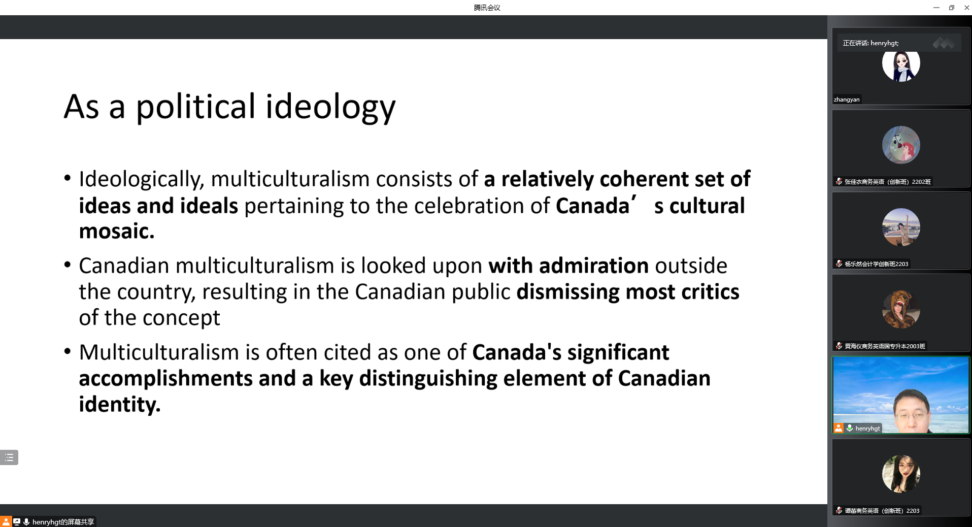 第十三期学术沙龙主题为:加拿大多元文化主义,由惠耕田副教授主讲。加拿大是世界上最早实行文化多元主义的国家。加拿大文化多元主义既是社会现实,也是政府政策和意识形态。惠教授在本期沙龙中围绕加拿大文化多元主义的概念内涵、发生背景、历史演变、发展特色以及各方评价为主线,使师生对加拿大国情之文化多元主义有更为精准、深刻和全面的把握,提高科学认知的水平。