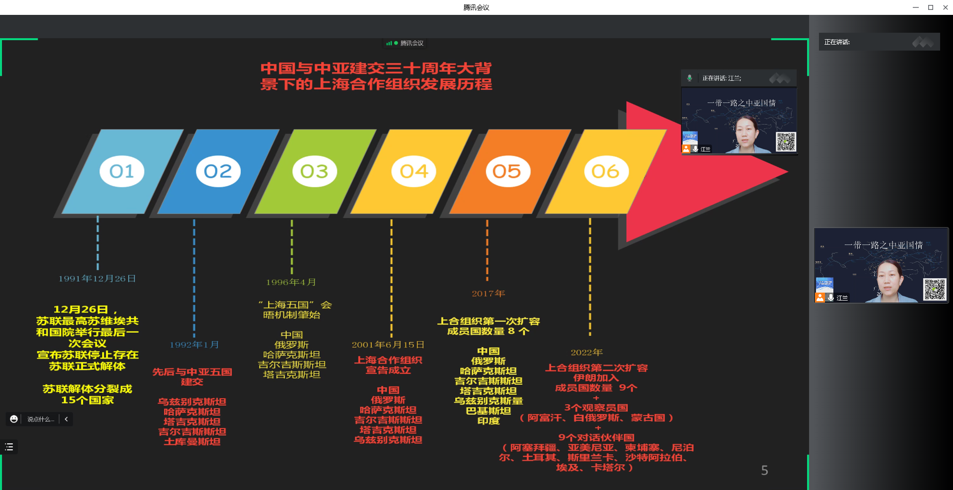 第五期学术沙龙主题为:上海合作组织的发展历程,由江兰博士主讲。在本期沙龙中,江博士主要介绍了上海合作组织的重要性和发展历程。上合组织成立的20多年间,不断发展壮大,从当初的6个创始成员国,到如今不断增加的观察员国和对话伙伴,上合组织是当前世界上最大的区域组织,覆盖了大约40%的世界人口。通过上合组织,中方能够与各成员国进行多层次的交流,中国也不断推动欧亚地区经济的发展。