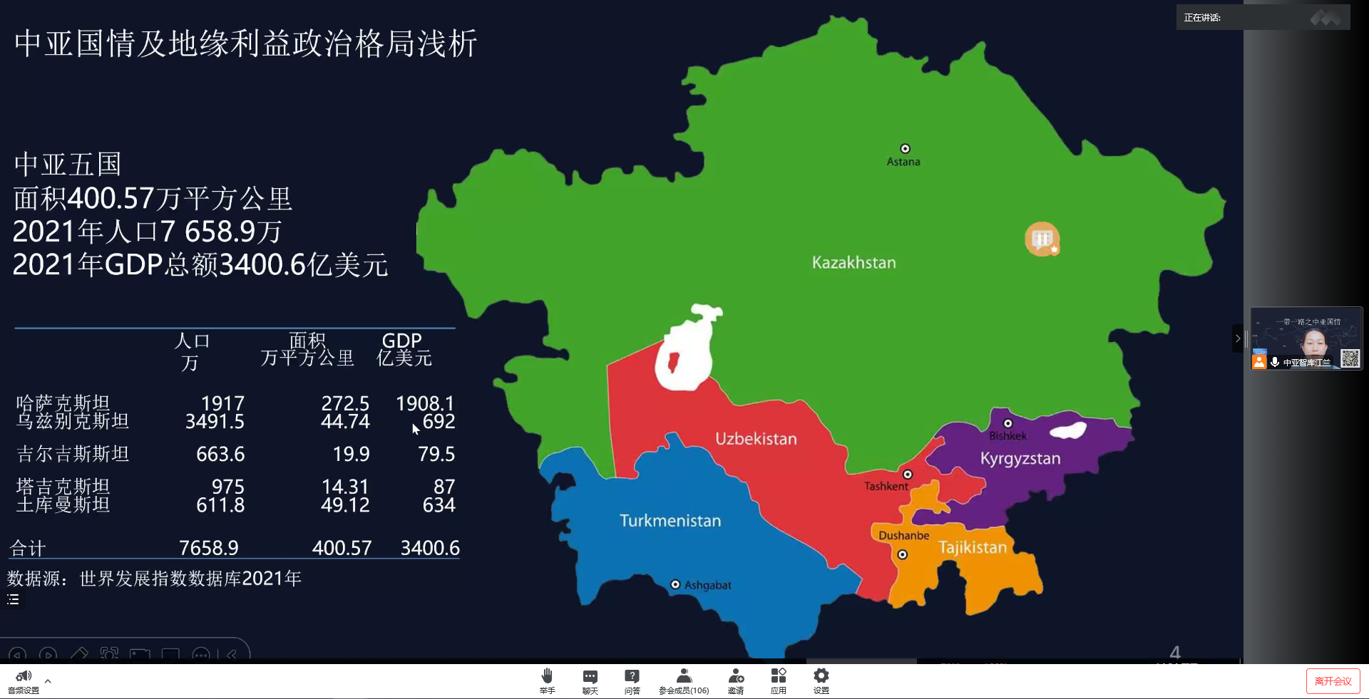 第四期学术沙龙主题为:一带一路之中亚国情与投资风险,由江兰博士主讲。在本期沙龙中,江博士主要为大家介绍中亚国情系列三---《投资风险识别及对策》。“一带一路”建设必将开辟新的大时代。我们需要在“一带一路”的重点方向、重点布局重要任务,加强顶层设计,推进科技体系创新,凝聚国际创新资源,构建国际协同创新平台的同时,整合国际化商务、咨询人才智力资源,发挥资源协同作用最大效应,结合自身区位优势打造中亚区域专家人才智库,团结各方专家、学者、企业、机构,为“一带一路”做好桥梁和纽带,保驾护航。