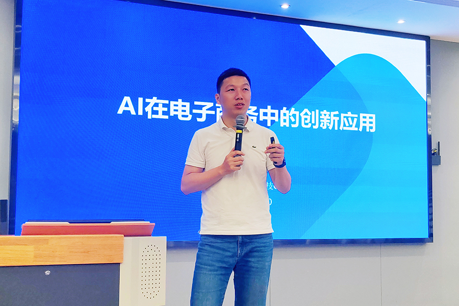 接着,周黄宁就人工智能在电子商务中的创新应用展开演讲。他从AI和电商发展背景、电商发展现状与挑战、AI+电商模式运行流程及其优势三个模块讲解了人工智能的技术原理及其在电子商务行业中的重要性。周黄宁认为,AI相较于人工而言具有海量数据处理整合、无休自动化运行、降低运营成本和用户隐私保护的功能优势,这些优势可以帮助商家将繁琐、复杂、常态化的工作进行压缩,从而使工作更高效、推送更精准、服务更完善。另外,周黄宁还分享了三个成功的AI应用案例:Amazon的智能推荐、Zara自动化客服和Wal-Mart智慧仓储,形象地讲解了人工智能是通过什么方式在改变电商生态。