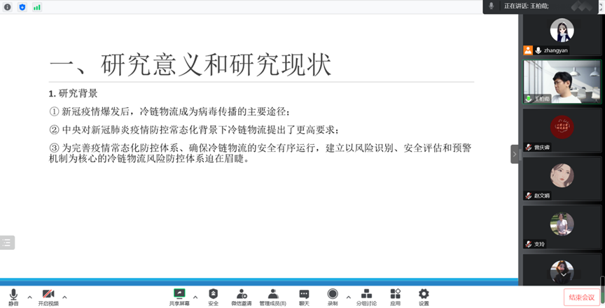 本次需要开题的科研项目分别为由王柏荀博士负责的2022年度广东省哲社课题,题目为疫情常态化背景下广东省冷链物流疫情风险防控机制研究;曾庆睿博士负责的2022年度广东省普通高校认定类课题,题目为:“双碳-双循环”背景下粤港澳大湾区绿色低碳发展策略研究。