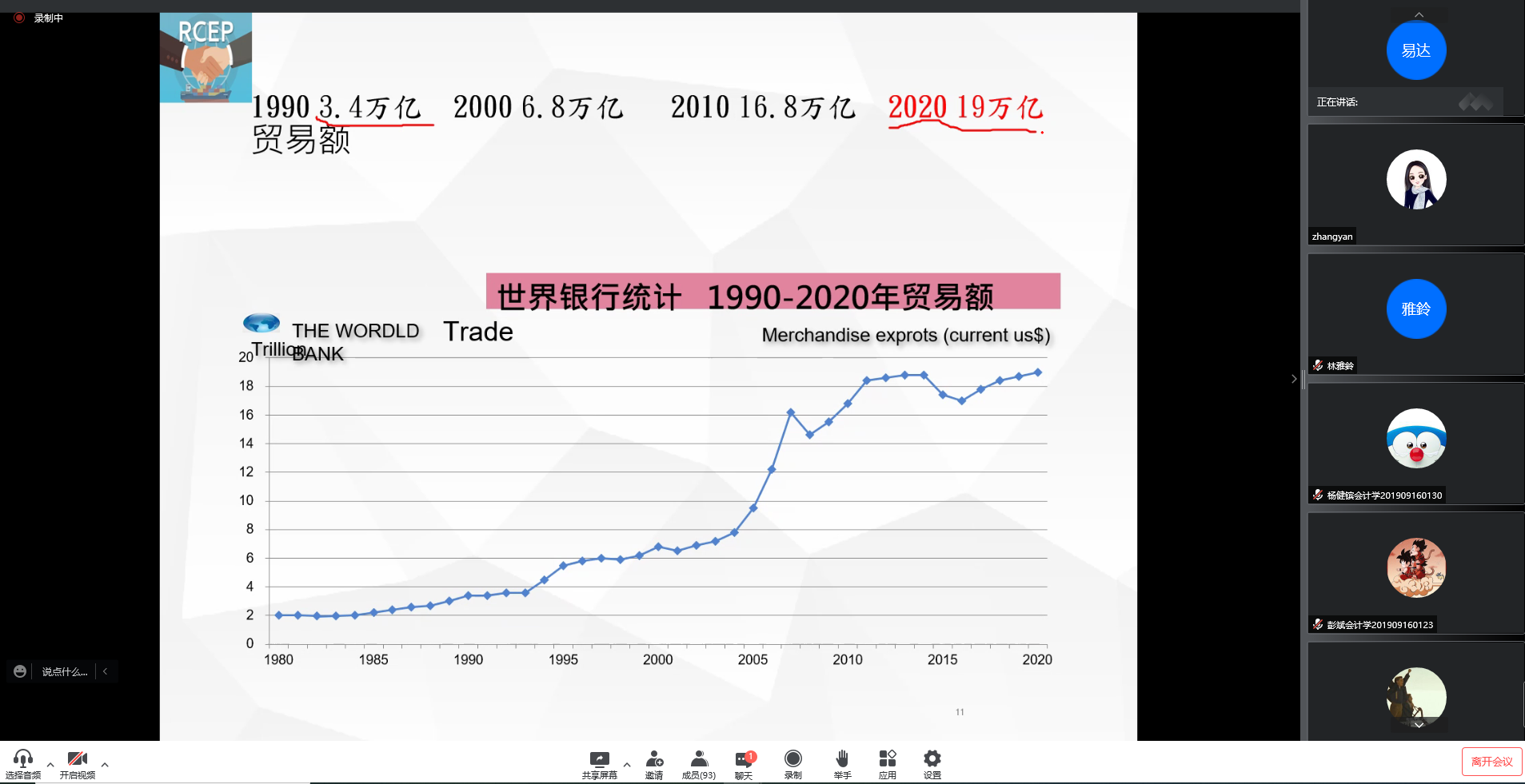 第七期沙龙主题为新形势下的对外贸易新挑战与社会实践,由邹易达博士主讲。RECP是应对经济全球化和区域经济一体化的发展而提出,邹博士通过广泛收集官方权威数据,对2022年各大洲经济增速、国际能源及原物料价格走势进行介绍,重点分析了我国签署RCEP在货物贸易、服务贸易和知识产权等方面带来的机遇,以及对国内三大产业、改革、全球化等造成的挑战,并提出相关应对对外贸易合作发展策略。