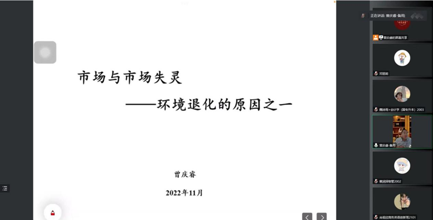 第八期学术沙龙主题为:市场与市场失灵——环境退化的原因之一,由曾庆睿博士主讲。市场是实现资源优化配置的有效形式,当市场运行顺畅时,可以促进各种商品的生产和分配。曾庆睿博士结合实际案例和丰富的数据,说明市场失灵,成为环境退化的原因之一,并向参与沙龙的师生发出了绿色生活的倡议。