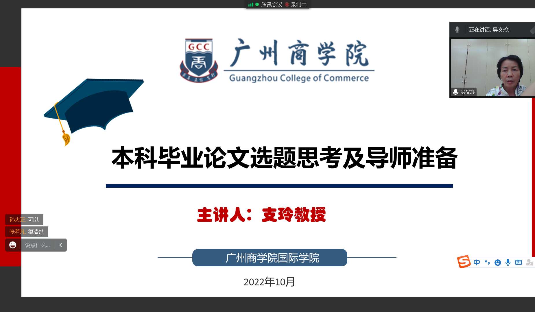主会场中支玲教授结合自身多年来的指导经验,建议教师在指导本科毕业论文过程中着力关注以下方面:第一,选题原则应遵循实践性 、专业性、创新性、可行性;第二,导师和员工都要高度重视开题环节,需要按照专家提出的建议认真修改选题;第三,判定题目性质、理论支撑、研究范围、研究方法、数据可得性。此外,支玲也总结了上一届本科毕业论文评审过程中常见的问题,为青年教师指导本科毕业论文提供了宝贵经验。最后,支玲建议导师要做好三个准备:一是心理准备,客观了解学情,因材施教;二是知识准备,指导员工也是一个不断学习的过程,导师要加强自身的知识积累与拓展,论文写作能力的训练与提升;三是履行导师责任准备,发挥敬业精神,严格把控过程管理。