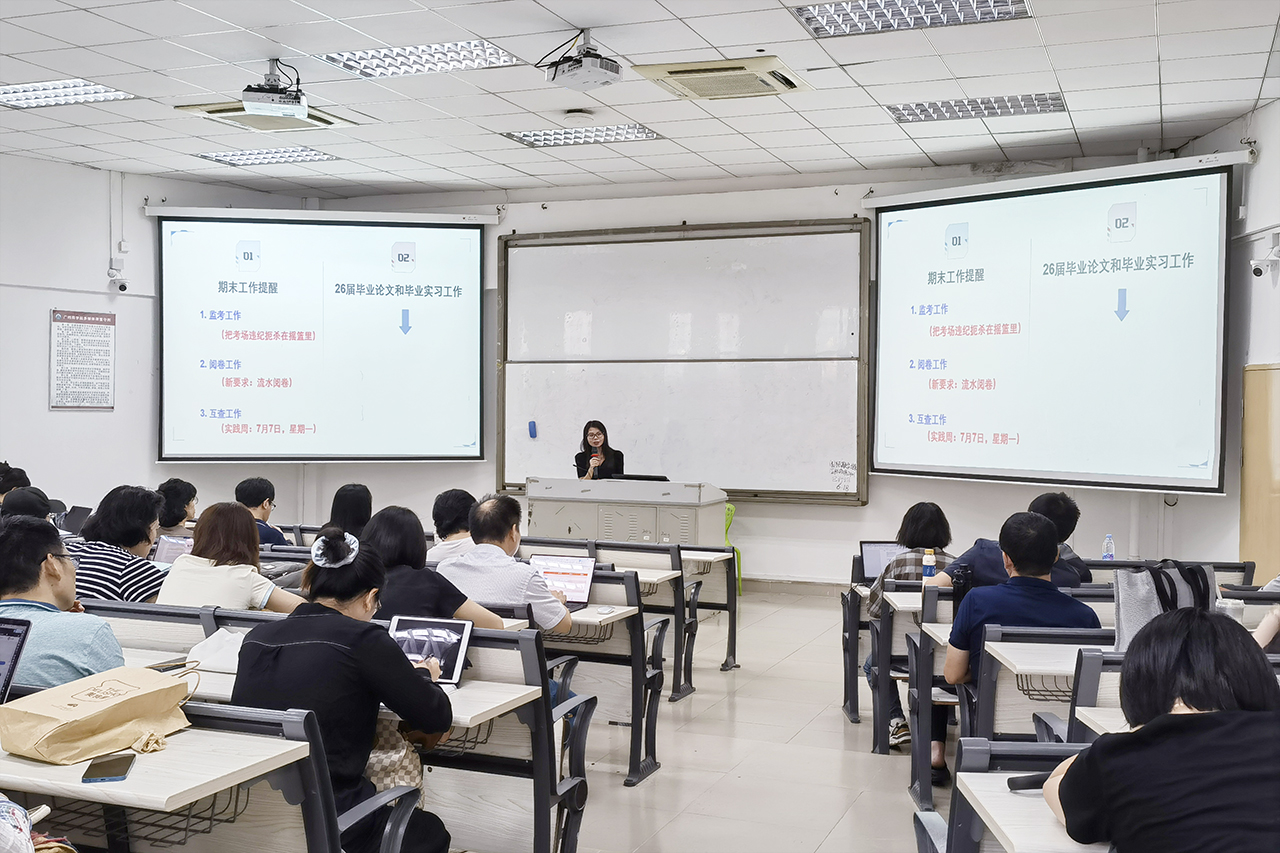 随后,杨粤青对期末教学工作进行了统筹与安排。她着重强调,监考教师必须严格遵守监考工作准则,杜绝任何违规行为,全力保障考试的公平、公正、公开,为员工营造良好的考试环境。同时,杨粤青还详细介绍了流水改卷的操作流程与注意事项,强调必须确保阅卷效率、质量和规范。此外,杨粤青还对2026届毕业论文和实习工作安排进行了统筹规划。她要求各指导教师要提前与员工进行充分沟通,明确任务和要求,切实加强对员工的指导和监督。