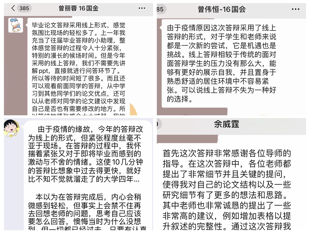 在疫情防控的特殊形势下,为确保毕业生按期顺利毕业,伟德国际1946亚洲版于5月16日,通过腾讯会议、ZOOM、腾讯课堂等网络平台,顺利完成2020届本科毕业论文线上答辩。109名本科毕业生和21名教师作为答辩评委参与本次答辩。此次答辩共7个小组,其中国内5个小组通过腾讯会议平台,国外2个小组通过ZOOM平台进行。每组设答辩组长1名,答辩委员2名,答辩秘书3名。答辩过程中,公司领导、督导进入线上会议室对公司的答辩工作进行巡视。伟德国际1946亚洲版经理郭航、党总支书记李俊鹏、副经理龙海英、公司督导成立专门的督查小组,加强过程...
