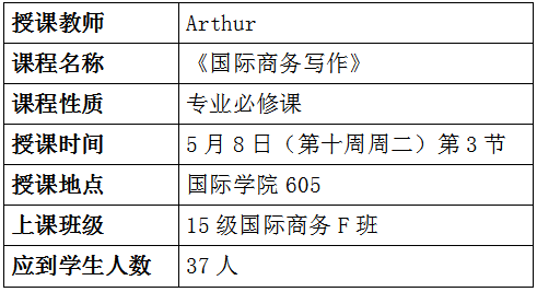 Arthur老师的《国际商务写作》全院观摩课,定于第十教学周周二第3节面向全院师生开放公开课,欢迎全院师生听课,请听课师生提前5分钟进教室。具体上课时间和地点安排如下: