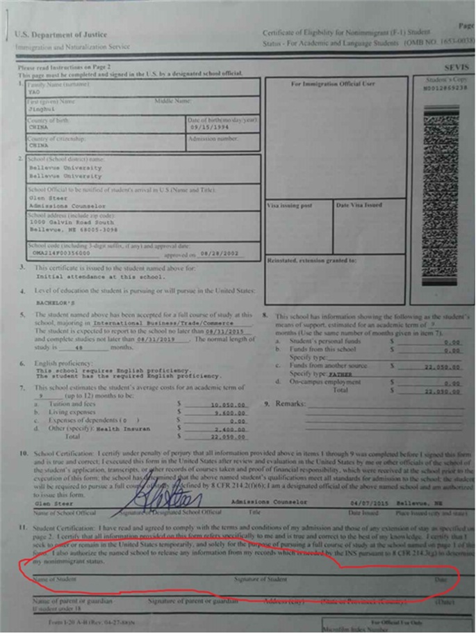 3. I-20 原件 (请同学们出发前在I-20第一页底部Name of Student 横线上面写名字拼音,Signature of Student 横线上面签中文名,Date 写日期,格式不限)