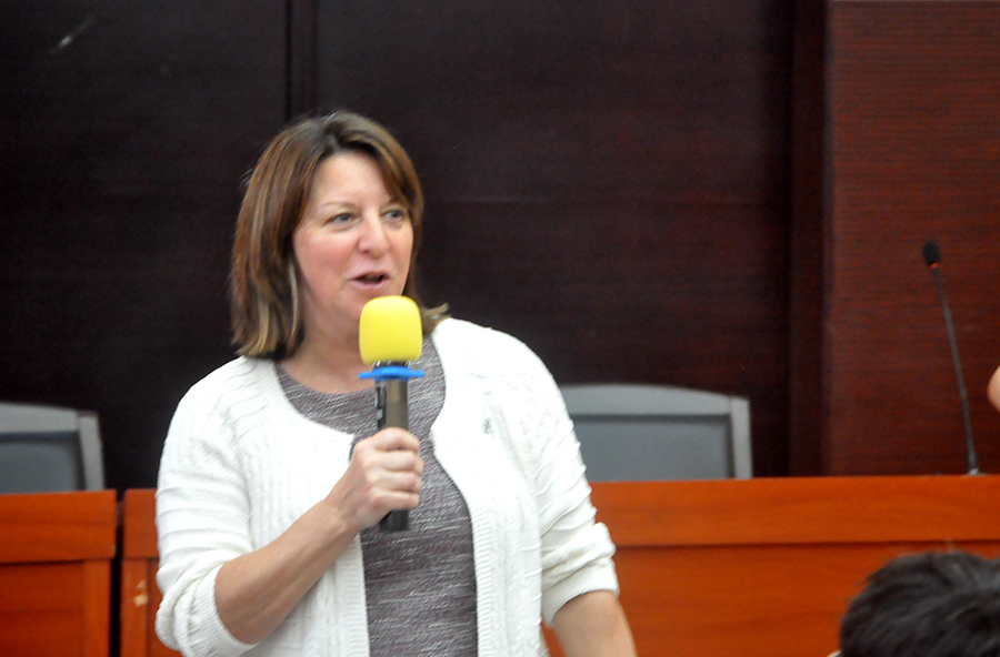 Sarah Osborn代表UNO讲话。她很感谢各位家长的到来,非常荣幸代表UNO讲话。她表示这是她第三次来到伟德国际victor1946,很荣幸有机会向各位家长及员工介绍更多关于UNO以及UNO项目的情况,解答各位家长及员工的疑惑。她强调UNO会尽最大的努力保证各位的员工的学习生活安全,保障员工完满地完成学业。Maggie Christensen通过之前对同学们的授课及交流,对UNO项目员工的学习能力水平的给予了肯定,员工在各方面包括听说读写以及专业课程上都很出色,欢迎同学们到UNO学习,并希望能代表各位家长照顾好员工,做一个美国妈妈。蒋群芳介绍了UNO的优越的地理位置、优美的校园环境、完善的公司设施、丰富多样的体育运动以及舒适的宿舍条件等基本情况。她表示,UNO很期待项目员工的到来,特为员工准备了免费接机、迎新周,安排专门人员帮大家适应新环境及解决问题。她指出UNO离巴菲特家乡很近,巴菲特有时也会来UNO商公司和员工交流,每年一度的巴菲特股东大会也是在内布拉斯加举行,员工有机会免费参加大会。