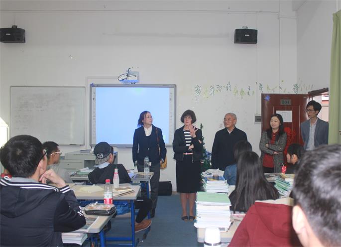 3月28日上午, 公司中美管理学双学位项目合作方美国贝尔维尤大学董事长Mary Hawkins和国际部教师Julie Verebely来访公司并到各班级探望中美管理学双学位项目学子。伟德国际1946亚洲版经理胡光忠、副主任唐丽峰及伟德国际1946亚洲版部分老师陪同探望。