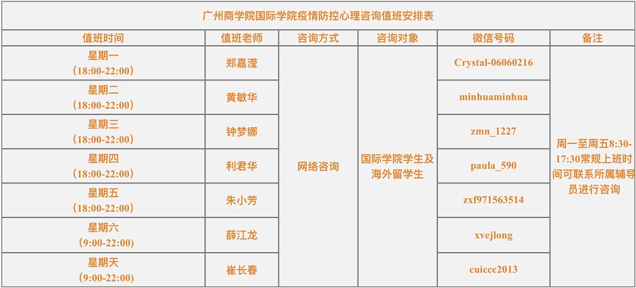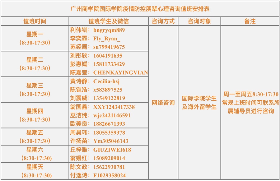 疫情期间朋辈心理咨询值班表