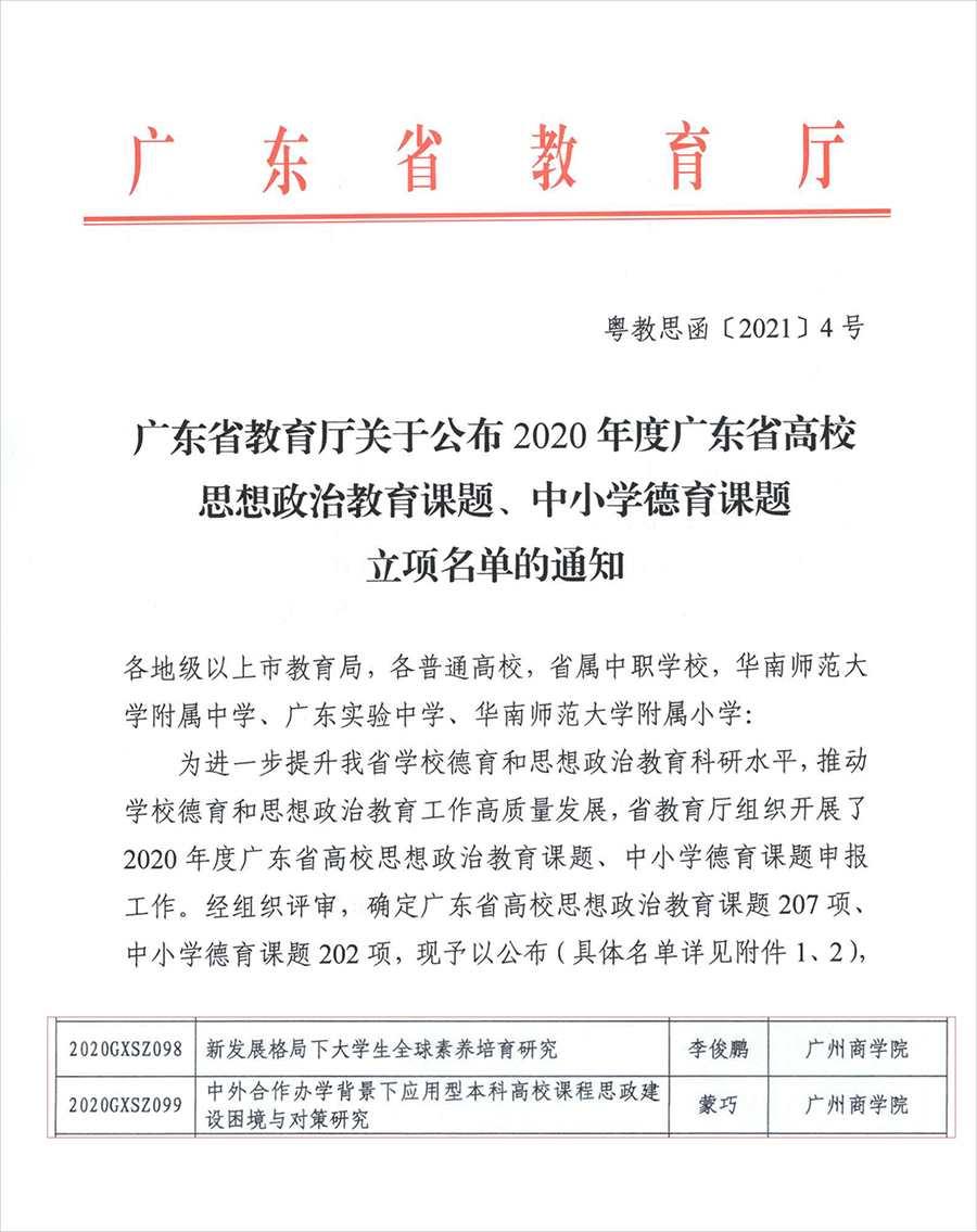 近日,广东省教育厅公布了2020年度广东省高校思想政治教育课题立项名单,伟德国际1946亚洲版李俊鹏、蒙巧申报的课题喜获立项。 李俊鹏作为负责人申报的《新发展格局下老员工全球素养培育研究》在理论上寻找人类命运共同体理念下,针对当前新发展格局对国内外人才需求情况与老员工全球素养的内在关联,推进老员工全球素养问题的研究;在实践上对高校老员工全球素养的能力需求作全面分析,梳理高校人才培养与老员工思想政治教育的质量提升的关联,为高校培养一批能参与全球治理的人才提供可行的新策略和新思路。蒙巧作为负责人申报的《...